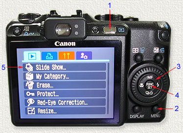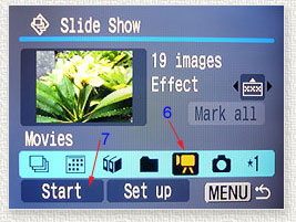 Recording Video Clips To play slide show of recorded video clips continuously : select "Slide Show" and select "Movies" then "Start". The slide show can be viewed from the 3" LCD screen or from a TV if the AV Out of G9 is connected to the AV In of TV set. Tip for Recording Video Shots to DVD Recorder 1. Connect the AV Out from G9 to DVD recorder. 2. Press the Picture Viewing button of G9 (1). 3. Press Menu button (2), select Slide Show (3) and press Function Set (4) 4. Select Movies (6), then Start (7), and press Function Set (4). The Slide Show will begin for videos only. 5. Press Record on DVD recorder to record the videos. |